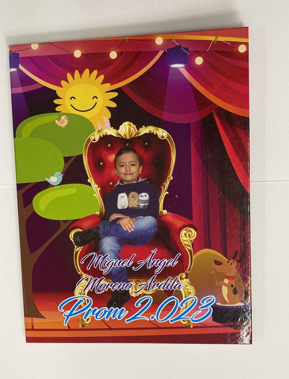 Carpeta con diseño animado y espacio central para incluir mensajes, cuentos o dedicatorias. Estilo llamativo y alegre.